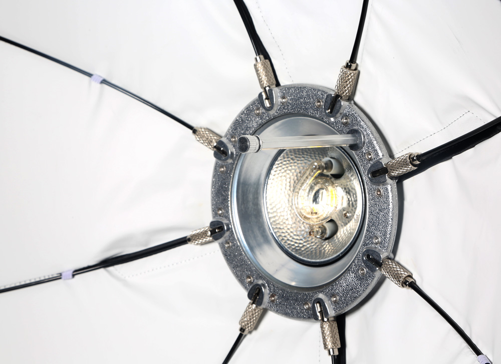 Since beauty dishes don't have to have a diffusion panel (sock) over them, we're going to remove the diffuser from the softbox we're using.